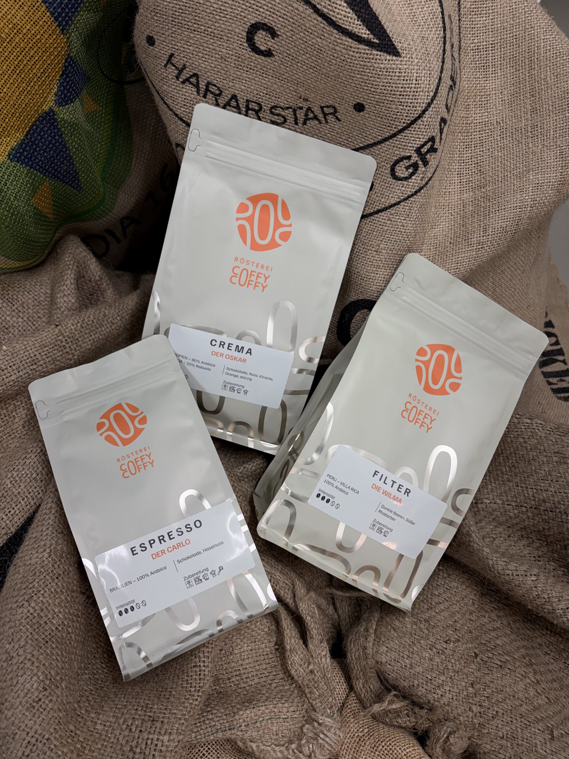 Ich versuche gar nicht, alles für jeden zu sein. Coffy Coffy steht für Handwerk, Persönlichkeit und Nähe. Ein wichtiger Teil unserer Identität sind auch die Namen der Kaffees. Unsere Sorten heißen nicht nach komplizierten Fincas oder Nummern, sondern tragen Vornamen wie „Die Lola“, „Die Wilma“ oder „Der Oskar“. Diese Idee entstand eher zufällig, ist aber geblieben. Die Namen haben einen persönlichen Bezug – zu Familie, Freunden oder auch Haustieren – und sie sind leicht zu merken. Das Schöne ist: Die Kundinnen und Kunden übernehmen diese Sprache. Sie sagen nicht „Ich hätte gern den Crema XY“, sondern „Ich nehme nochmal die Lola“. Genau das zeigt mir, dass Kaffee hier nicht anonym ist, sondern eine Geschichte bekommt. Zusätzlich arbeite ich viel im B2B-Bereich, entwickle individuelle Kaffees für Unternehmen und biete Private Labels an. Diese Nähe und Individualität machen uns nicht austauschbar.